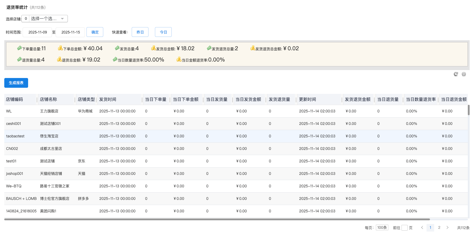 以店铺为维度,汇总记录每家前端店铺每日的销售总数量、售后总数量及金额。(数据非实时) 默认展示所有店铺数据。