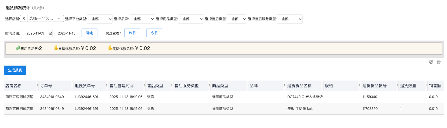 以退换货单为维度,统计售后产生退货的商品及金额情况。