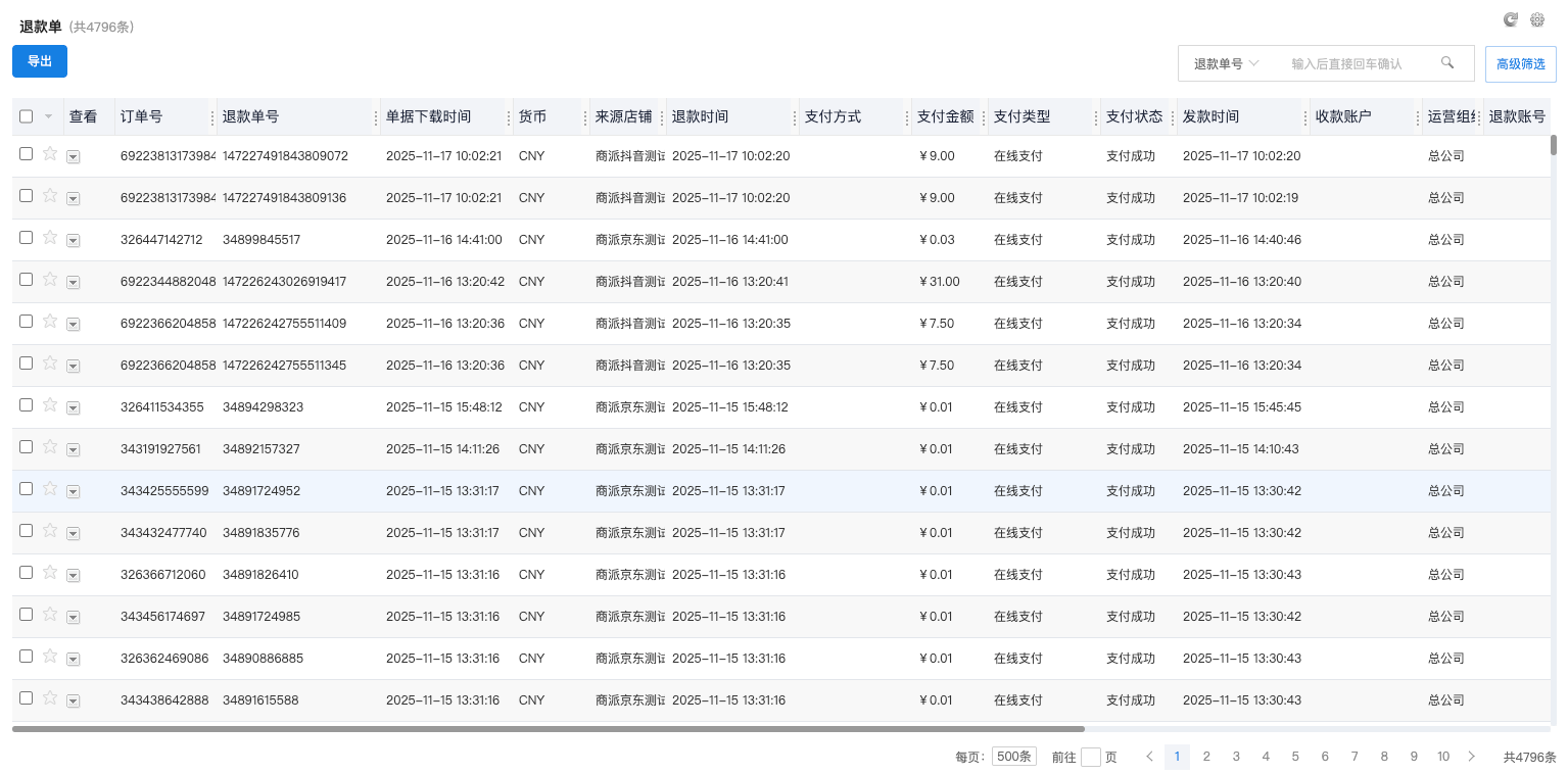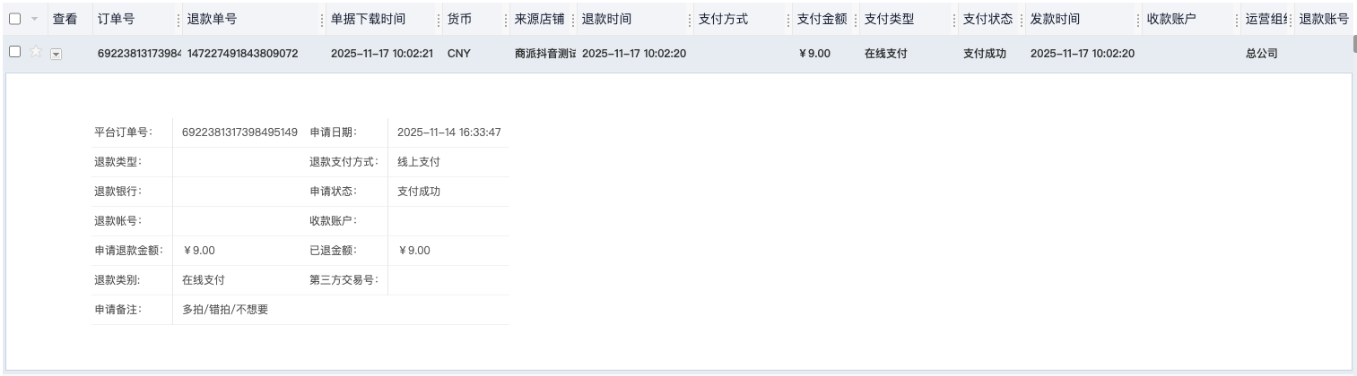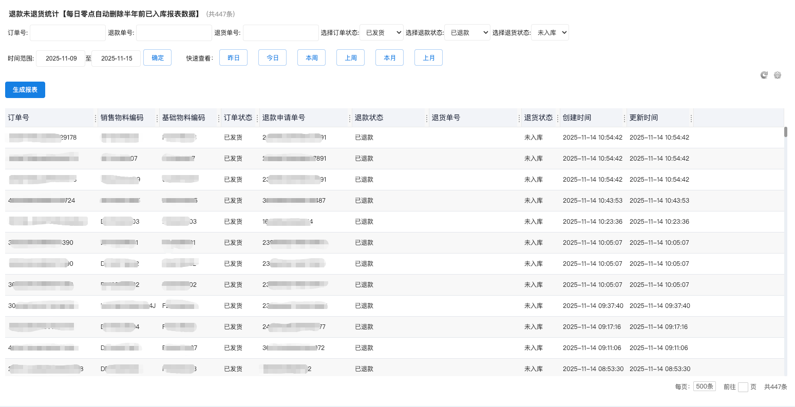 为应对平台仅退款业务,针对退款但退货未入库的情况可以通过报表展示及时跟进异常单据的情况。