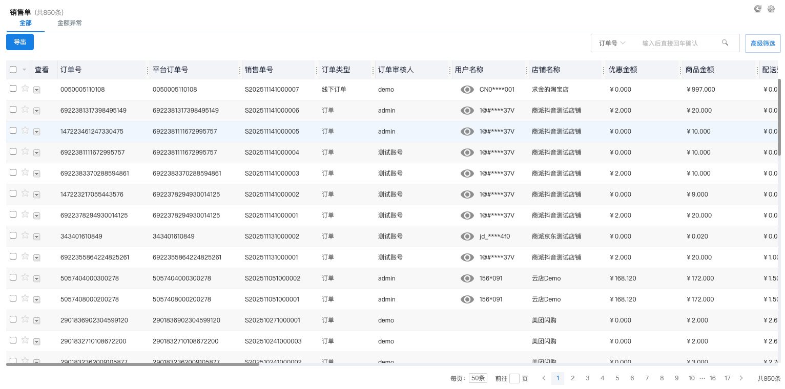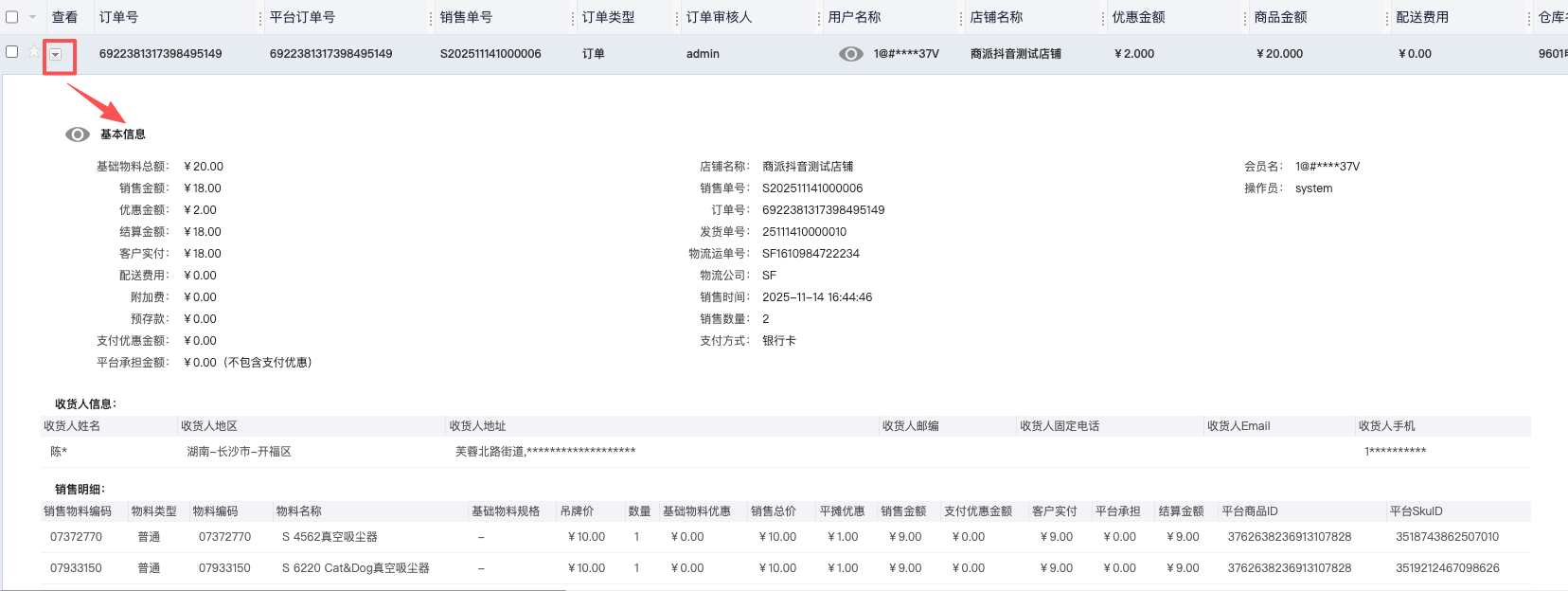 点击“查看”的倒三角,可以查看销售单详情,“销售明细”展示订单销售物料级的金额分摊明细,包括吊牌价、商家优惠、平台优惠、支付优惠、客户实付、优惠分摊等
