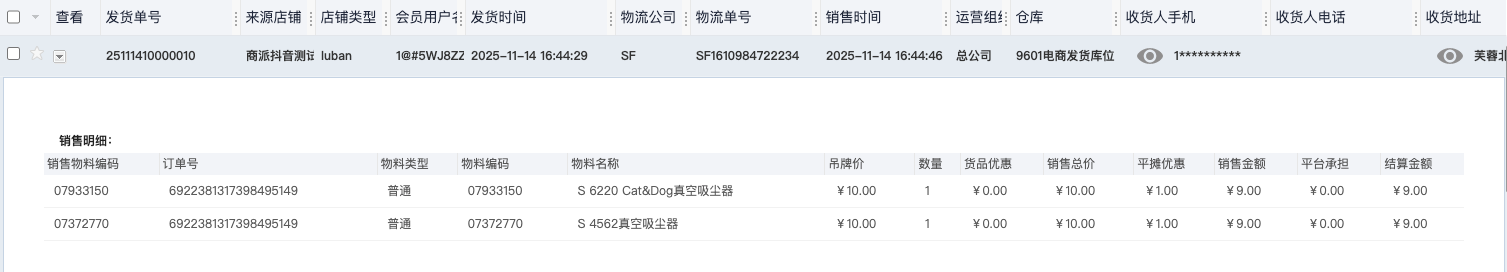 点击“查看”的倒三角,查看发货销售单详情,只展示销售物料的销售总价、优惠分摊、销售金额、平台承担优惠、结算金额
