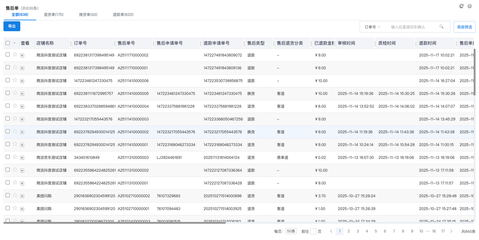 系统中完结的售后单的列表展示,包括退款、退货、换货,退货中包括客退和原单退(原单退指发货后拦截原返回仓库)