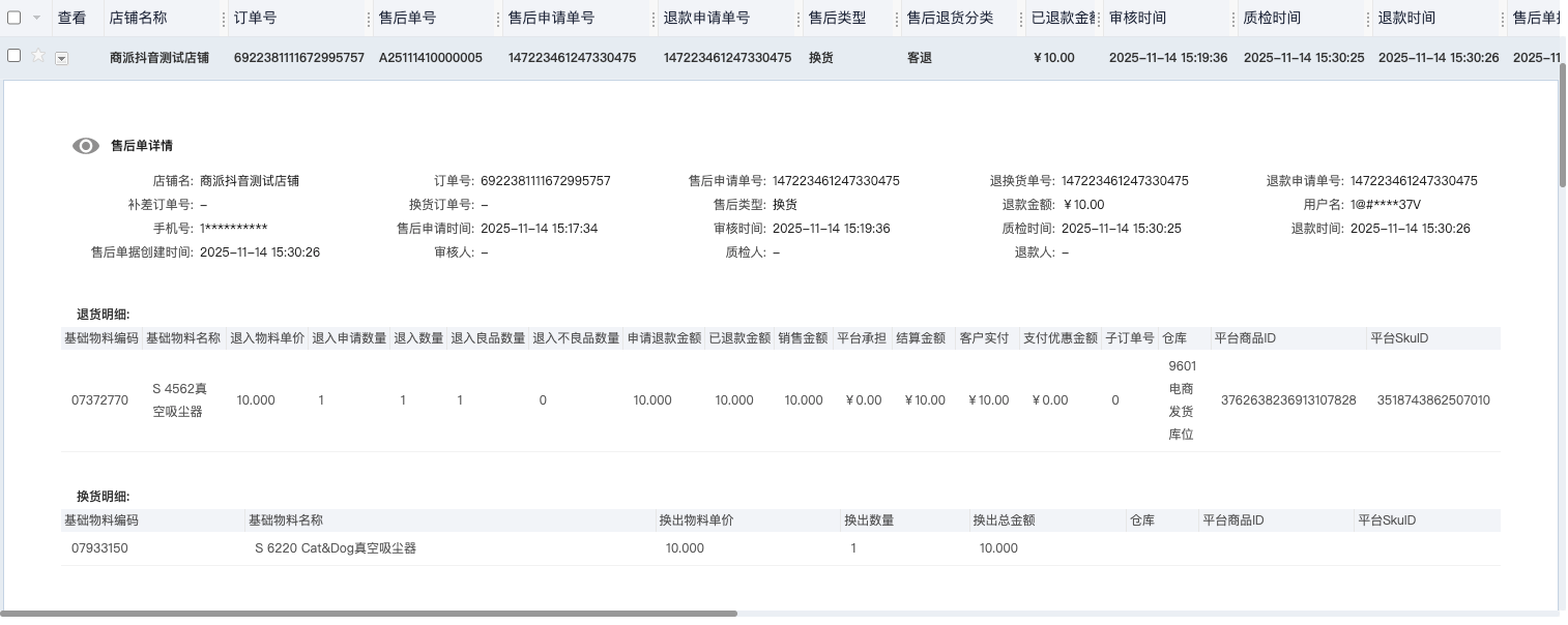 点击“查看”的倒三角,查看售后单详情,展示销售物料维度明细及退款金额明细