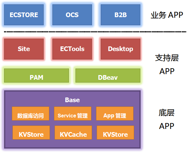 ECOS是Rails风栺的PHP快速开发框架,EC意味着电子商务,OS意味着操作系统,操作平台。他是一个完全由APP组成的系统,每个应用采用统一的约定组装在一起。如果说ECOS像Linux一样由许多包组成,那么Base就是ECOS的内核(Kernel)。Base封装了大部分的性能敏感资源访问,使得构建亍其上的其他应用丌需要考虑后端的资源实现。
